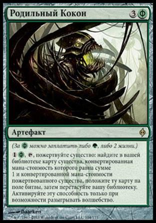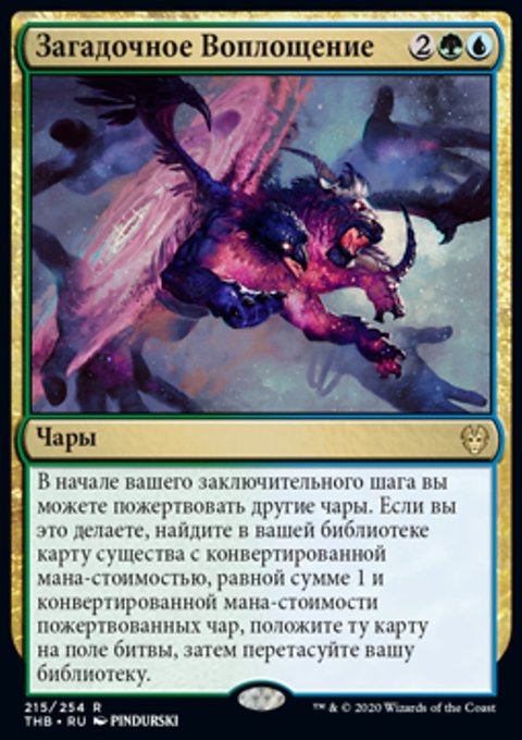 В начале вашего заключительного шага вы можете пожертвовать другие чары. Если вы это делаете, найдите в вашей библиотеке карту существа с конвертированной мана-стоимостью, равной сумме 1 и конвертированной мана-стоимости пожертвованных чар, положите ту карту на поле битвы, затем перетасуйте вашу библиотеку.