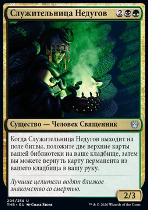 Когда Служительница Недугов выходит на поле битвы, положите две верхние карты вашей библиотеки на ваше кладбище, затем вы можете вернуть карту перманента из вашего кладбища в вашу руку.