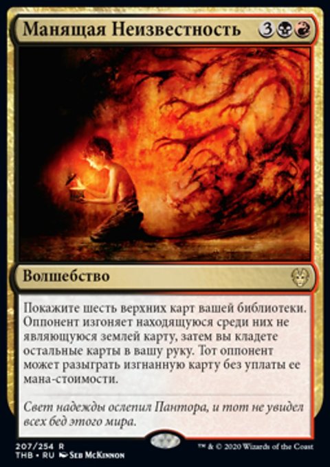 Покажите шесть верхних карт вашей библиотеки. Оппонент изгоняет находящуюся среди них не являющуюся землей карту, затем вы кладете остальные карты в вашу руку. Тот оппонент может разыграть изгнанную карту без уплаты ее мана-стоимости.