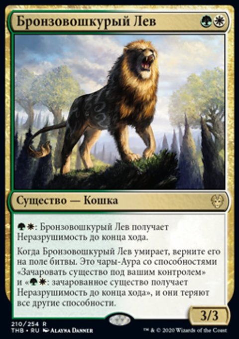Когда Бронзовошкурый Лев умирает, верните его на поле битвы. Это чары-Аура со способностями «Зачаровать существо под вашим контролем» и «