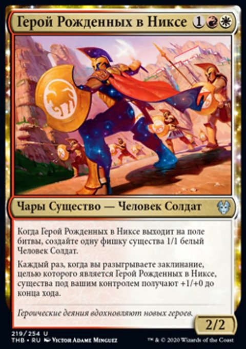 Каждый раз, когда вы разыгрываете заклинание, целью которого является Герой Рожденных в Никсе, существа под вашим контролем получают +1/+0 до конца хода.