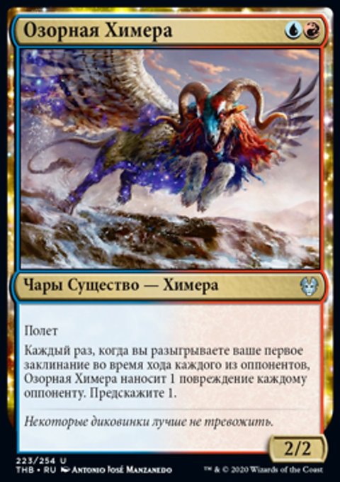 Каждый раз, когда вы разыгрываете ваше первое заклинание во время хода каждого из оппонентов, Озорная Химера наносит 1 повреждение каждому оппоненту. Предскажите 1.