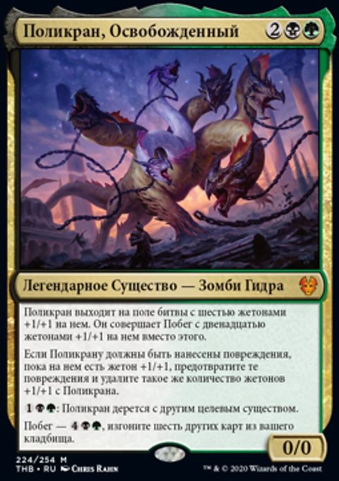 Поликран выходит на поле битвы с шестью жетонами +1/+1 на нем. Он совершает Побег с двенадцатью жетонами +1/+1 на нем вместо этого.