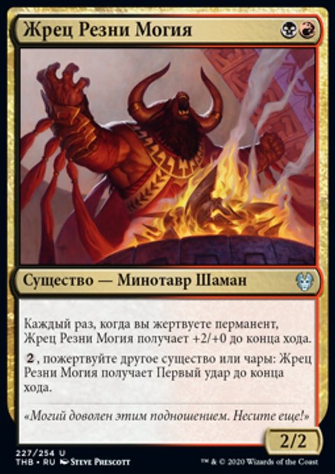 Каждый раз, когда вы жертвуете перманент, Жрец Резни Могия получает +2/+0 до конца хода.