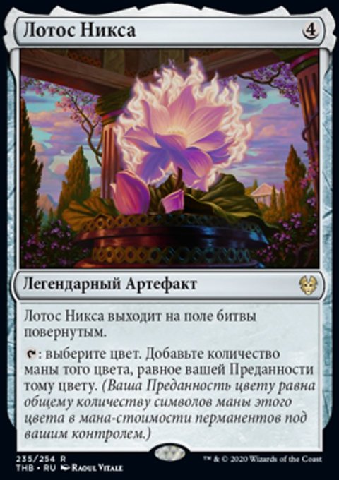 : добавьте одну ману любого цвета. Если у вас под контролем есть Бог, Полубог или легендарные чары, вы получаете 1 жизнь.