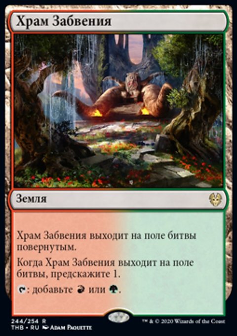 Когда Храм Забвения выходит на поле битвы, предскажите 1. (Посмотрите верхнюю карту вашей библиотеки. Вы можете положить ту карту в низ вашей библиотеки.)