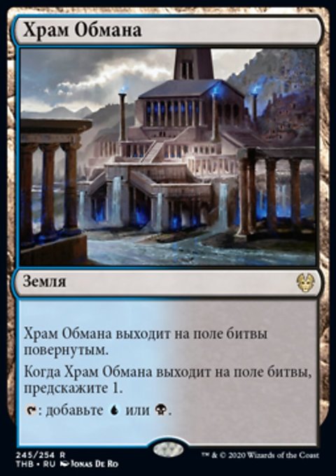 Когда Храм Обмана выходит на поле битвы, предскажите 1. (Посмотрите верхнюю карту вашей библиотеки. Вы можете положить ту карту в низ вашей библиотеки.)