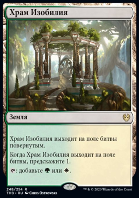 Когда Храм Изобилия выходит на поле битвы, предскажите 1. (Посмотрите верхнюю карту вашей библиотеки. Вы можете положить ту карту в низ вашей библиотеки.)