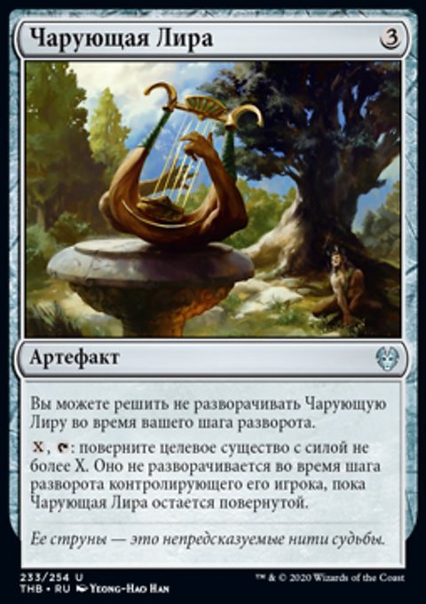 : поверните целевое существо с силой не более X. Оно не разворачивается во время шага разворота контролирующего его игрока, пока Чарующая Лира остается повернутой.