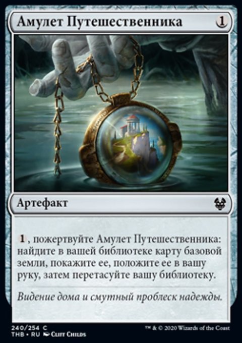 , пожертвуйте Амулет Путешественника: найдите в вашей библиотеке карту базовой земли, покажите ее и положите в вашу руку. Затем перетасуйте вашу библиотеку.