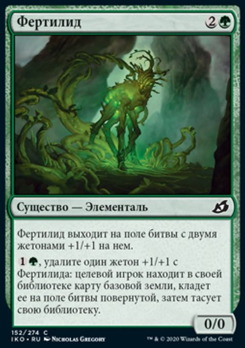 , Удалите один жетон +1/+1 с Фертилида: Целевой игрок находит в своей библиотеке карту базовой земли и кладет ее в игру повернутой. Затем тот игрок тасует свою библиотеку.