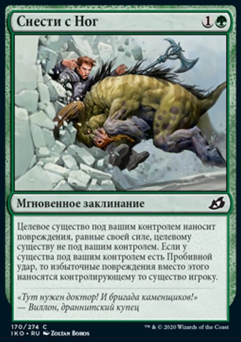 Target creature you control deals damage equal to its power to target creature you don't control. If the creature you control has trample, excess damage is dealt to that creature's controller instead.