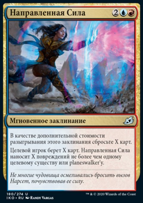 Target player draws X cards. Channeled Force deals X damage to up to one target creature or planeswalker.