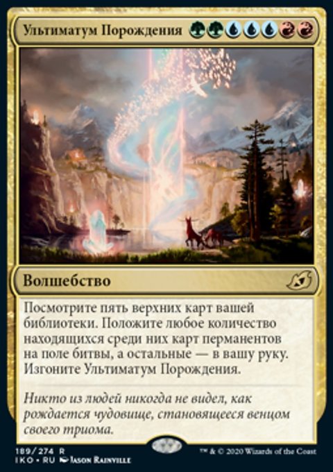 Look at the top five cards of your library. Put any number of permanent cards from among them onto the battlefield and the rest into your hand. Exile Genesis Ultimatum.