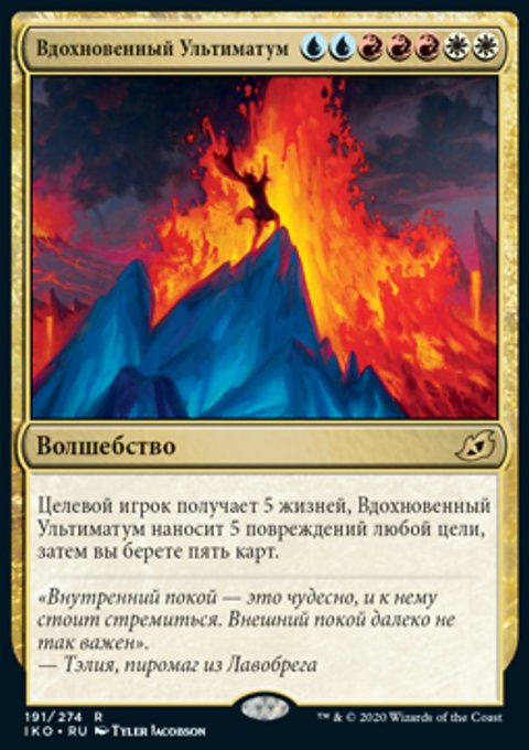 Target player gains 5 life. Inspired Ultimatum deals 5 damage to any target. You draw five cards.