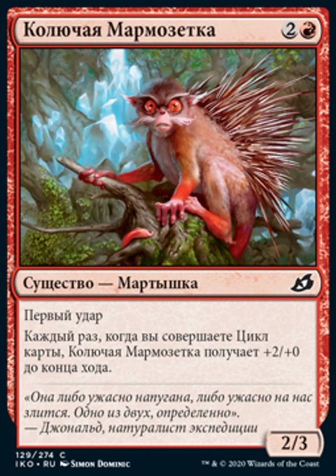 Whenever you cycle a card, Prickly Marmoset gets +2/+0 until end of turn.
