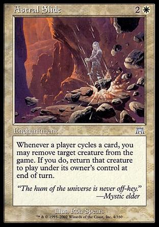 Whenever a player cycles a card, you may exile target creature. If you do, return that card to the battlefield under its owner's control at the beginning of the next end step.