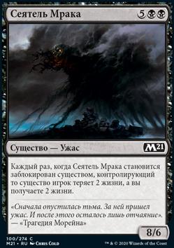 Каждый раз, когда Сеятель Мрака становится заблокирован существом, контролирующий то существо игрок теряет 2 жизни, а вы получаете 2 жизни.