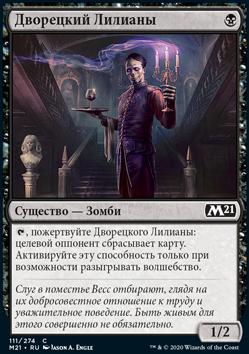 , пожертвуйте Дворецкого Лилианы: целевой оппонент сбрасывает карту. Активируйте эту способность только при возможности разыгрывать волшебство.