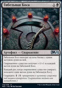 Каждый раз, когда снаряженное существо умирает, положите один жетон души на Гибельную Косу.