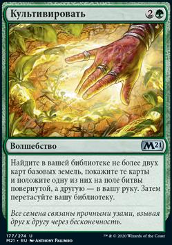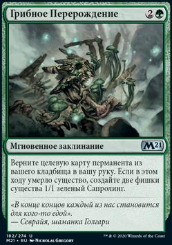 Верните целевую карту перманента из вашего кладбища в вашу руку. Если в этом ходу умерло существо, создайте две фишки существа 1/1 зеленый Сапролинг.