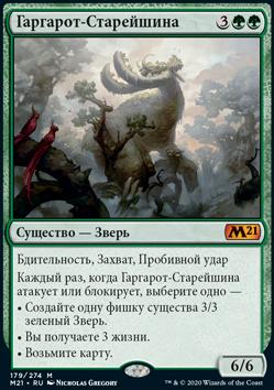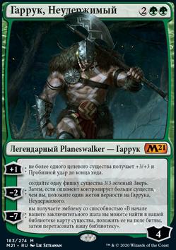 −2: создайте одну фишку существа 3/3 зеленый Зверь. Затем, если оппонент контролирует больше существ, чем вы, положите один жетон верности на Гаррука, Неудержимого.