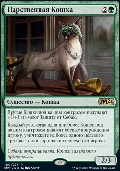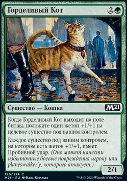 Когда Горделивый Кот выходит на поле битвы, положите один жетон +1/+1 на целевое существо под вашим контролем.