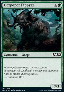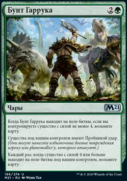 Когда Бунт Гаррука выходит на поле битвы, если вы контролируете существо с силой не менее 4, возьмите карту.