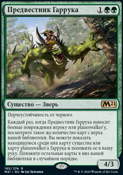 Каждый раз, когда Предвестник Гаррука наносит боевые повреждения игроку или planeswalker'у, посмотрите такое же количество карт с верха вашей библиотеки. Вы можете показать находящуюся среди них карту существа или карту planeswalker'а Гаррука и положить ее в вашу руку. Положите остальные карты в низ вашей библиотеки в случайном порядке.