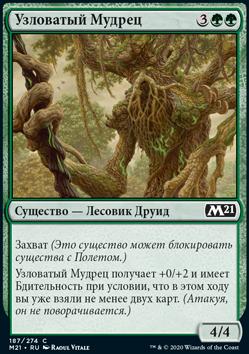 Узловатый Мудрец получает +0/+2 и имеет Бдительность при условии, что в этом ходу вы уже взяли не менее двух карт. (Атакуя, он не поворачивается.)