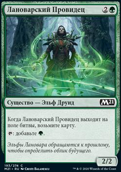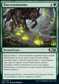 Предскажите 3, затем покажите верхнюю карту вашей библиотеки. Если это карта существа или земли, возьмите карту. (Чтобы предсказать 3, посмотрите три верхние карты вашей библиотеки, затем положите любое количество из них в низ вашей библиотеки, а остальные на верх вашей библиотеки в любом порядке.)