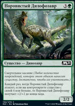 Каждый раз, когда Норовистый Дилофозавр атакует, если вы контролируете существо с силой 4 или больше, то Норовистый Дилофозавр получает +2/+2 до конца хода.