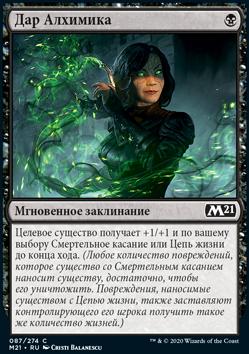 Целевое существо получает +1/+1 и по вашему выбору Смертельное касание или Цепь жизни до конца хода. (Любое количество повреждений, которое существо со Смертельным касанием наносит существу, достаточно, чтобы его уничтожить. Повреждения, наносимые существом с Цепью жизни, также заставляют контролирующего его игрока получить такое же количество жизней.)