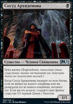 Когда Сосуд Архидемона выходит на поле битвы, если он вышел из вашего кладбища или вы разыграли его из вашего кладбища, изгоните его. Если вы это делаете, создайте одну фишку существа 5/5 черный Демон с Полетом.