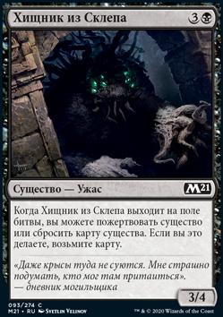 Когда Хищник из Склепа выходит на поле битвы, вы можете пожертвовать существо или сбросить карту существа. Если вы это делаете, возьмите карту.