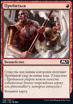 Существа под вашим контролем имеют Пробивной удар. (Они могут нанести избыточные боевые повреждения игроку или planeswalker'у, которого атакуют.)