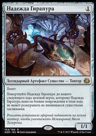 Пожертвуйте Надежду Гирапура: до вашего следующего хода целевой игрок, которому Надежда Гирапура нанесла боевые повреждения в этом ходу, не может разыгрывать не являющиеся существами заклинания.