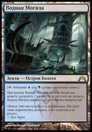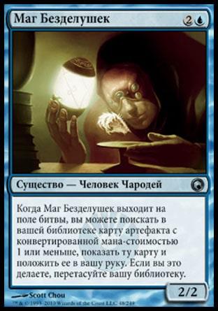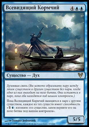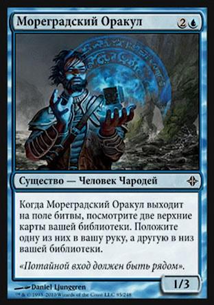 Когда Кормчий Приливных Пещер входит в игру, целевой оппонент показывает свою руку, и вы выбираете из нее не являющуюся землей карту. Удалите ту карту из игры.