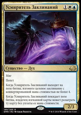 Когда Усмиритель Заклинаний выходит на поле битвы, изгоните целевое заклинание с конвертированной мана-стоимостью не более 4.