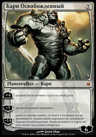 -14: начните партию заново, оставляя в изгнании все не являющиеся Аурами карты перманентов, изгнанные Карном Освобожденным. Затем положите те карты на поле битвы под вашим контролем.