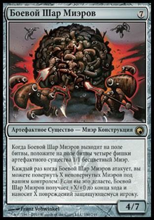 Когда Боевой Шар Миэров выходит на поле битвы, положите на поле битвы четыре фишки артефактного существа 1/1 бесцветный Миэр.