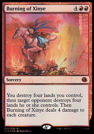 You destroy four lands you control, then target opponent destroys four lands he or she controls. Then Burning of Xinye deals 4 damage to each creature.