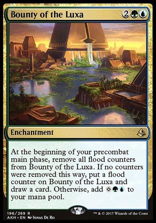 At the beginning of your precombat main phase, remove all flood counters from Bounty of the Luxa. If no counters were removed this way, put a flood counter on Bounty of the Luxa and draw a card. Otherwise, add