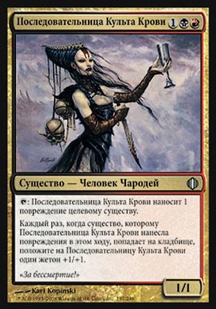 Каждый раз, когда существо, которому Последовательница Культа Крови нанесла повреждения в этом ходу, попадает на кладбище, положите на Последовательницу Культа Крови один жетон +1/+1.