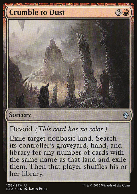 Изгоните целевую небазовую землю. Найдите на кладбище, в руке и в библиотеке контролирующего ту землю игрока любое количество карт с таким же именем, как у нее, и изгоните их. Затем тот игрок тасует свою библиотеку.