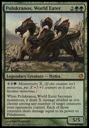 Когда Поликран, Пожиратель Миров становится чудовищным, он наносит X повреждений, разделенных по вашему выбору между любым количеством целевых существ под контролем ваших оппонентов. Каждое из тех существ наносит Поликрану повреждения, равные своей силе.