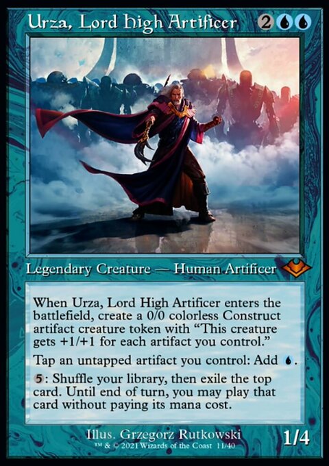 Когда Урза, Верховный Лорд-Механик выходит на поле битвы, создайте одну фишку артефакта существа 0/0 бесцветная Конструкция со способностью «Это существо получает +1/+1 за каждый артефакт под вашим контролем».
