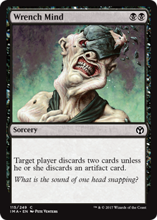 Target player discards two cards unless he or she discards an artifact card.