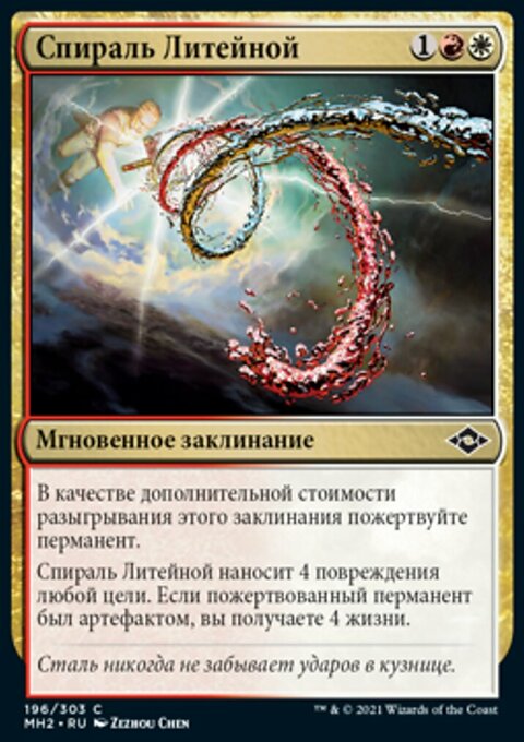 Спираль Литейной наносит 4 повреждения любой цели. Если пожертвованный перманент был артефактом, вы получаете 4 жизни.