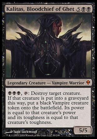 : уничтожьте целевое существо. Если то существо попадает на кладбище таким образом, положите на поле битвы одну фишку существа черный Вампир. Ее сила равна силе того существа, а ее выносливость равна выносливости того существа.